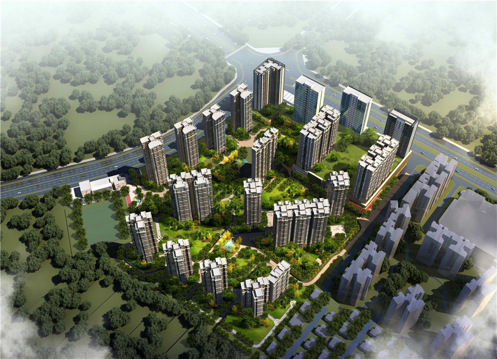 擬建筑物包括10棟高層住宅樓(1#-10#樓),2棟公寓和1棟幼兒園以及1~2層商業(yè)裙房,地下室兩層。