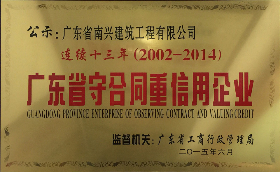 2002年-2014年度連續(xù)十三年獲得廣東省守合同重信用企業(yè)稱號(hào)